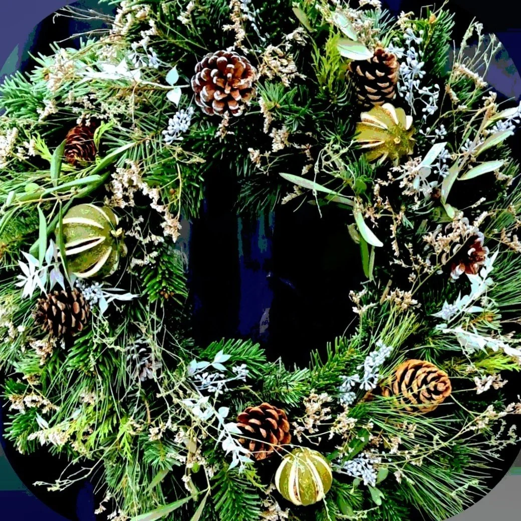 Each wreath I hand make using a selection of fresh spruce foilage. I pack the wreaths with eucalyptus, whole green oranges, sprigs of dried white limonium, painted white pine cones and olive leaves and finished with moss green satin ribbon. I will email you on receipt of payment to arrange convenient delivery which is available to Bristol, Bath, South Gloucestershire and North Somerset.